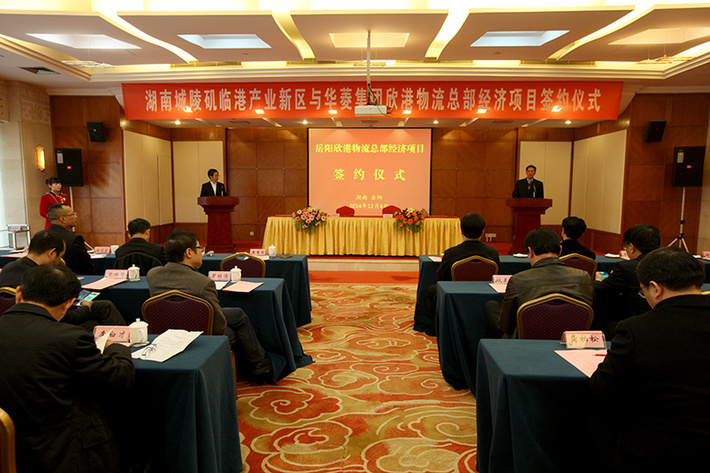 2014年12月4日上午,城陵磯臨港產(chǎn)業(yè)新區(qū)與華菱集團舉行岳陽欣港物流總部經(jīng)濟項目簽約儀式。市領(lǐng)導(dǎo)卿漸偉、盛榮華、李志堅、陳恢清,華菱集團董事長曹慧泉、總經(jīng)理李建國和市政府秘書長談?wù)t等見證簽約。