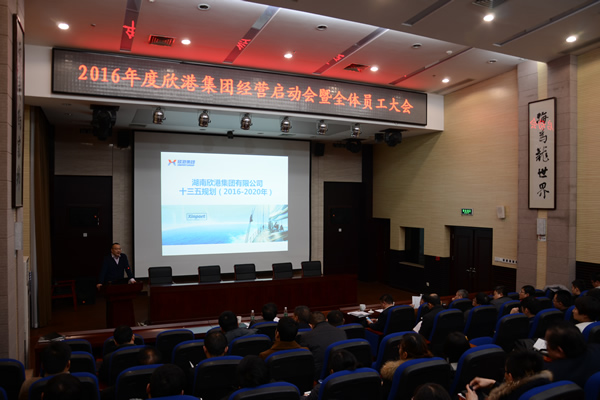 2016年1月30日,欣港集團(tuán)在長沙舉行2016年經(jīng)營啟動(dòng)會議暨全體員工大會,董事長湯志宏、總經(jīng)理申志軍及經(jīng)理層和本部、岳陽欣港全體員工、全資及參股子公司經(jīng)理層人員,約100人參加此會議。