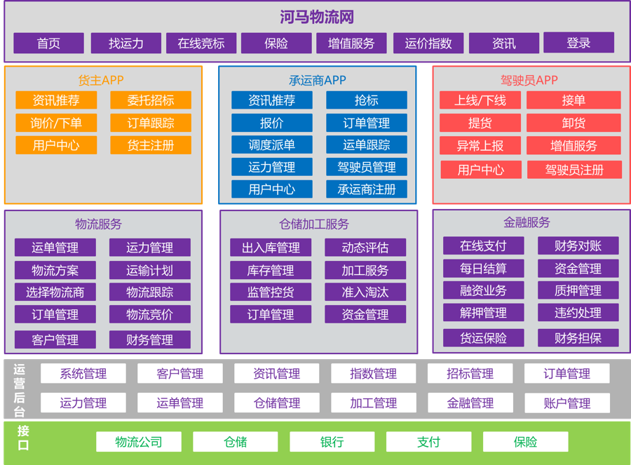 項目建設(shè)包括河馬物流網(wǎng)門戶網(wǎng)站、貨主APP、承運商APP、駕駛員APP、貨主PC操作臺、承運商PC操作臺、運營后臺、物流業(yè)務管理系統(tǒng)、倉儲管理系統(tǒng)集金融服務平臺等。整個平臺將企業(yè)招標、運力、保險、資訊等服務通過互聯(lián)網(wǎng)信息的方式進行快速傳遞,形成行業(yè)影響力。通過移動應用端提供貨主和承運商便捷的業(yè)務操作平臺,讓合作企業(yè)間的業(yè)務信息更及時、方便、高效的流通,提高物流企業(yè)的人員效率。按“無車承運人”這個輕量級的方式,通過互聯(lián)網(wǎng)應用的傳播方式,拓展和鞏固貨主、承運商體系建設(shè),提高企業(yè)物流業(yè)務規(guī)模和利潤。