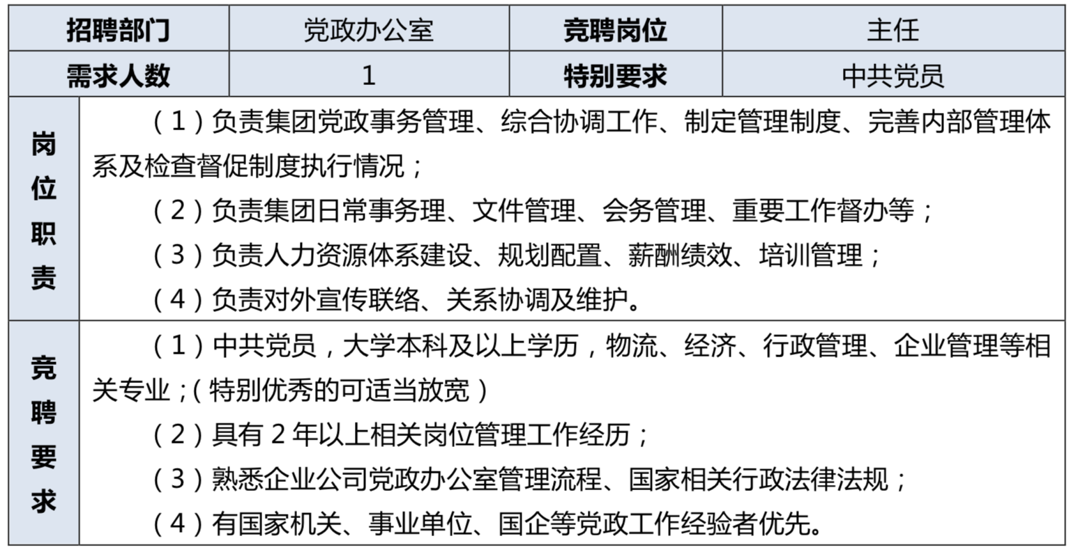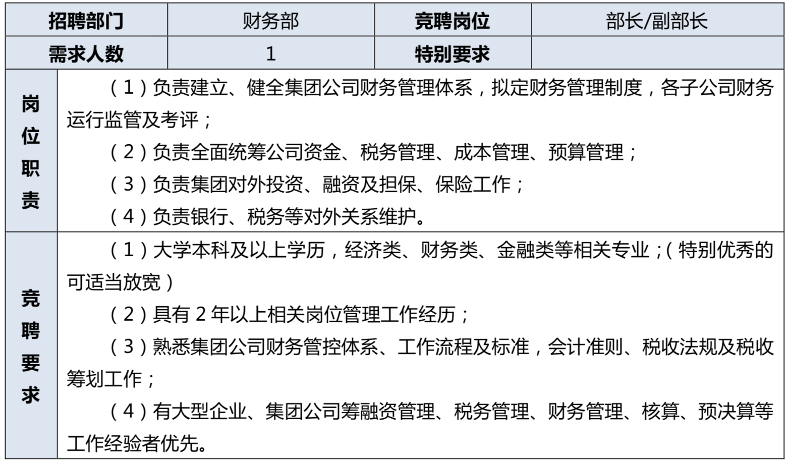 根據(jù)欣港集團(tuán)總部機(jī)關(guān)全員下崗競聘上崗實施方案要求,結(jié)合企業(yè)經(jīng)營管理和業(yè)務(wù)發(fā)展需要,現(xiàn)公開招聘黨政辦公室和財務(wù)部中層管理人員: