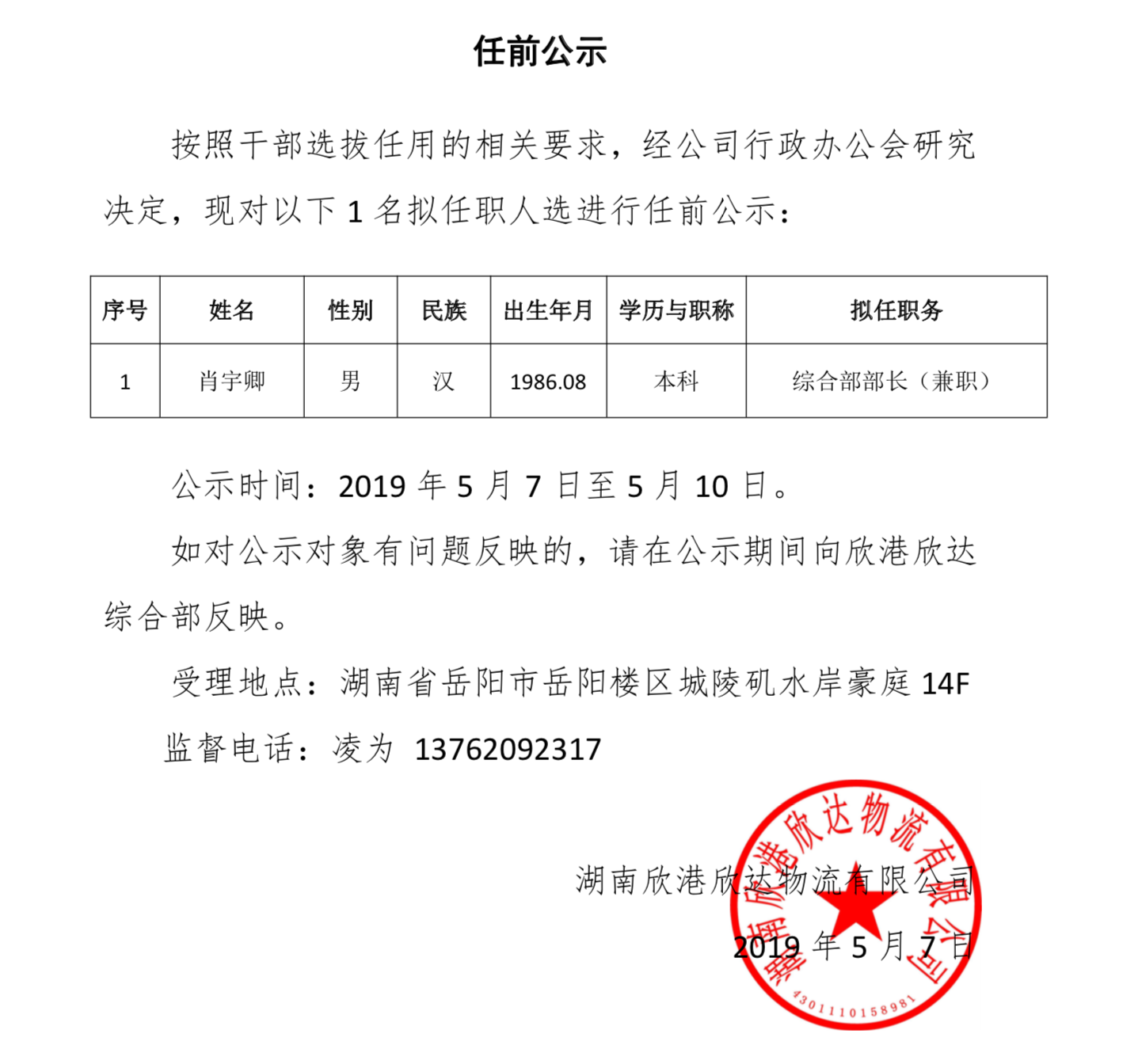 下一篇:湖南欣港欣達物流有限公司公開招聘公告2019-3-28